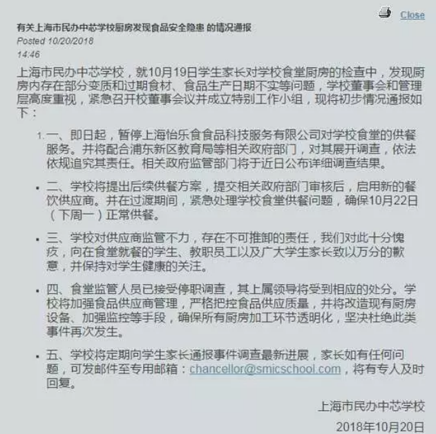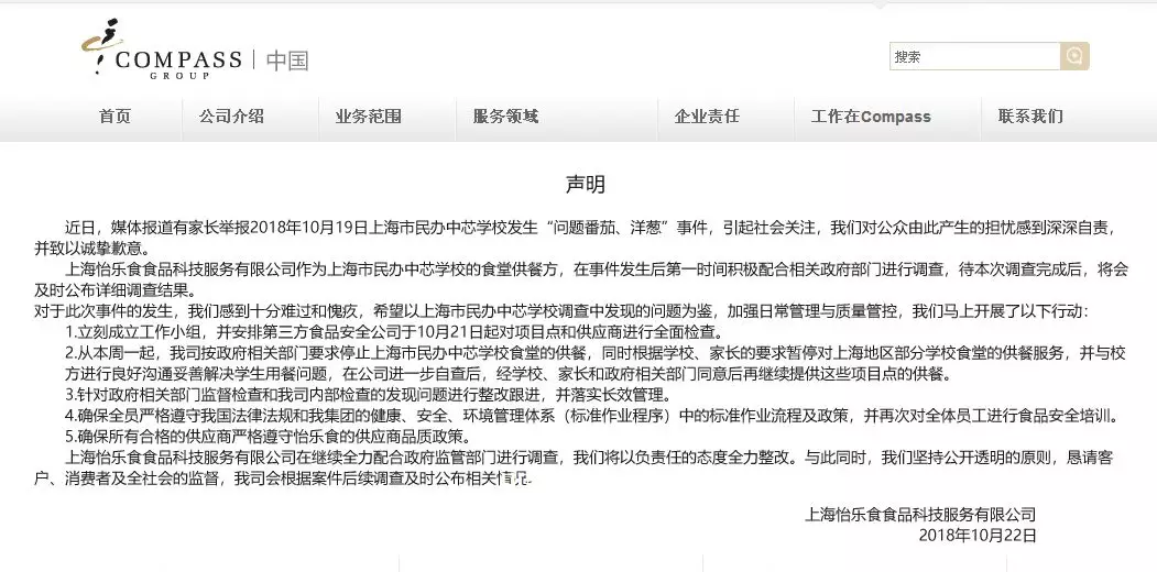根據(jù)學校的通報情況,該食堂的供應商是上海怡樂食食品科技服務有限公司,由康帕斯(compass)百分百占股,已經(jīng)為中芯國際學校服務四年。