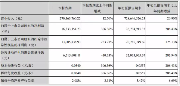公告顯示,海欣食品前三季度營業(yè)收入7.29億元,同比增長20.9%;歸屬于上市公司股東的凈利潤2679萬元,同比增長206.43%。
