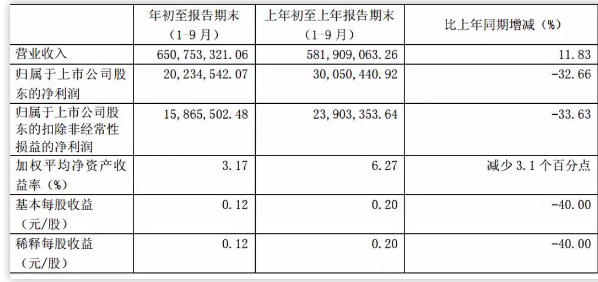 公告顯示,公司前三季度實現(xiàn)營業(yè)收入 6.51億元,較上年度同期5.82億增長11.83%;凈利潤2,023萬元,較上年度同期3,005萬元下降32.66%。