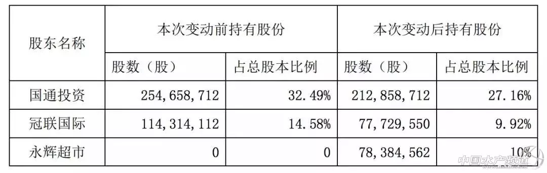 公告稱,國聯(lián)水產(chǎn)于 2018 年 3 月 23 日收到公司控制股東新余國通投資管理有限公司(以下簡稱“國 通投資”)、主要股東冠聯(lián)國際投資有限公司(以下簡稱“冠聯(lián)國際”)和永輝超市股份有限公司(以下簡稱“永輝超市”)簽署了《關(guān)于湛江國聯(lián)水產(chǎn)開發(fā)股 份有限公司之股份購買協(xié)議》的通知,國通投資和冠聯(lián)國際以協(xié)議轉(zhuǎn)讓的方式分別向永輝超市轉(zhuǎn)讓其持有的公司股份 41,800,000 股和 36,584,562 股,分別占公司股份總數(shù)的 5.33%和 4.67%,兩者合計(jì)轉(zhuǎn)讓公司股份 78,384,562 股,占公司股份總數(shù)的10%。