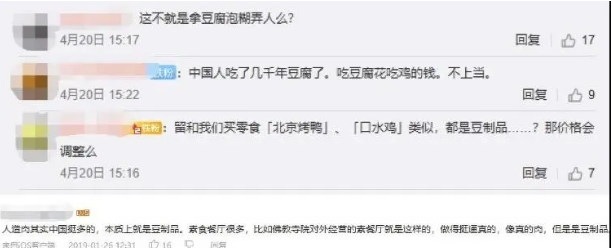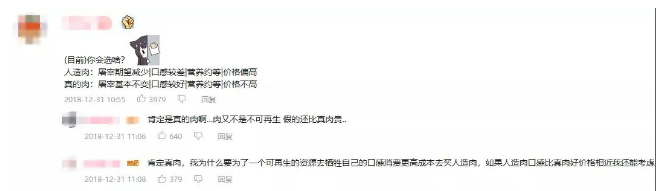 在B站、微博、微信上,“人造肉”相關(guān)內(nèi)容的評論欄中,消費者對其詬病主要集中在三個部分:價格貴、口感差、沒肉味。而這實際上也是目前阻礙中國“人造肉”企業(yè)發(fā)展、并且各個企業(yè)和研發(fā)機構(gòu)在攻克的三個維度。