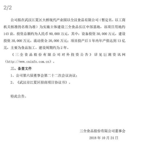 三全食品公告透露,選擇在武漢建廠,是為了靠近消費(fèi)市場。