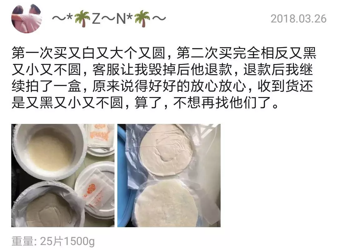 前面提到的三全、思念、安井等大多數(shù)品牌的手抓餅,每一片的重量通常都是90克、100克或者更多,然而拼多多上的手抓餅一片只有60克,還是帶上覆膜的重量,如果去掉覆膜還不足60克。重量縮水三分之一以上,用料也難免下降。