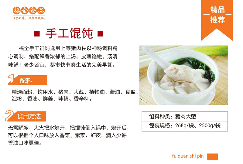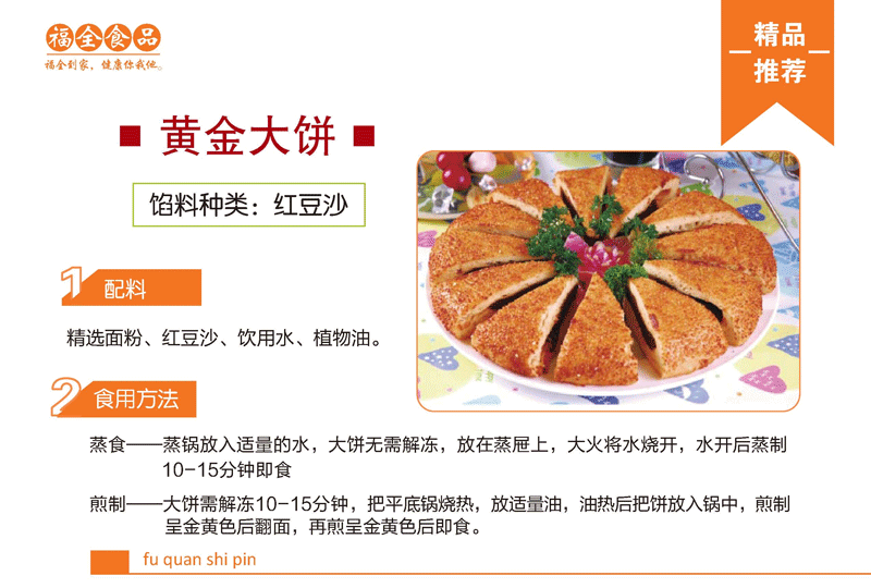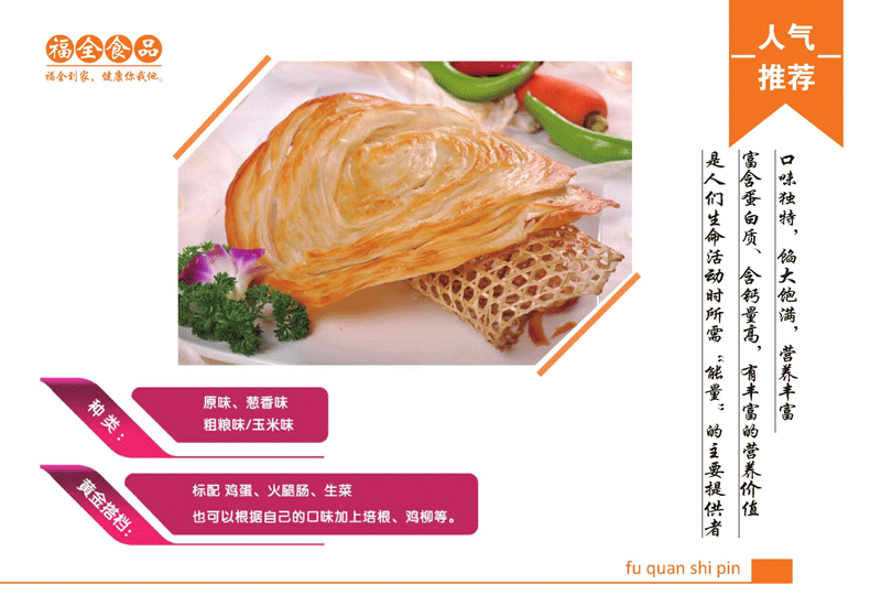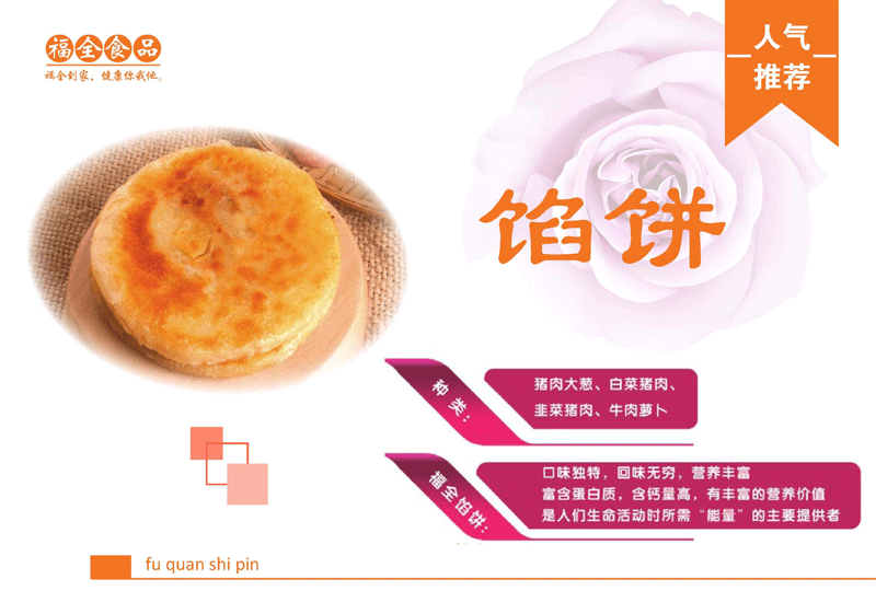 近年又相繼推岀大四喜、手抓餅、餡餅、雞蛋灌餅、春餅、餛鈍、黃金大餅、燒烤餃孑、水餃、水煎蒸餃等速凍食品。制作層層把關(guān),以顧客滿意為目標(biāo),依靠創(chuàng)新求發(fā)展,以更好的質(zhì)量和更高的效率保持企業(yè)的生命力,用誠信贏得廣大顧客的信賴,永遠不變的是我們的理念:真才實料、品質(zhì)至上、誠信經(jīng)營,進而提升“福全”品牌的美譽度.